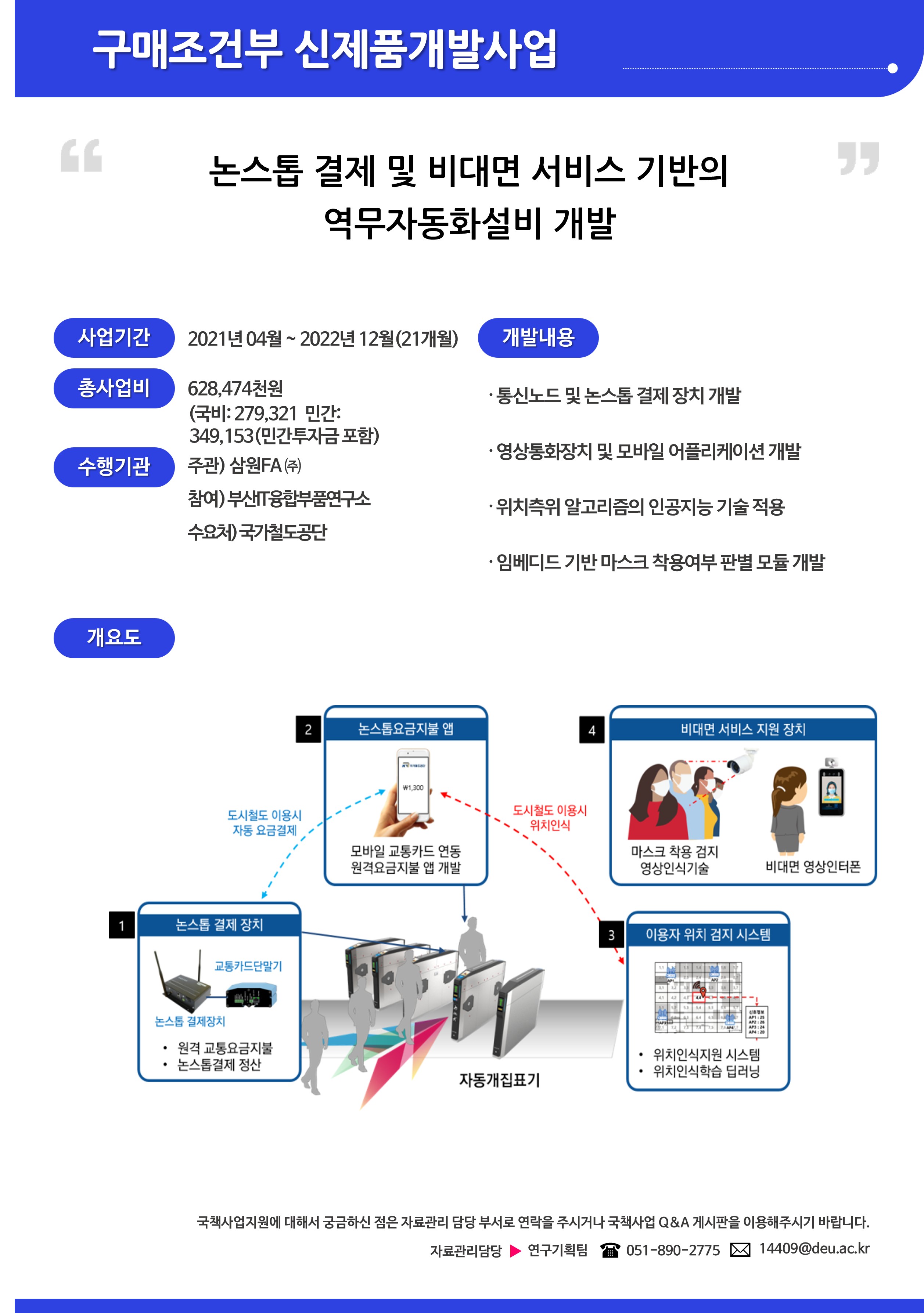 구매조건부 신제품개발사업(공동투자형) 페이지 정보 작성자 부산IT융합부품연구소 작성일24-06-05 14:54 조회686회 댓글0건 이전글 다음글 목록 사업명 구매조건부 신제품개발사업(공동투자형) 과제명 논스톱 결제 및 비대면 서비스 기반의 역무자동화설비 개발 사업기간 2021-04-01 ~ 2022-12-31 (21개월) 총 사업비 628,474천원 수행기관 주관) 삼원FA(주) / 참여) 부산IT융합부품연구소 부처 중소벤처기업부 상태 종료사업 본문 이전글 다음글 목록