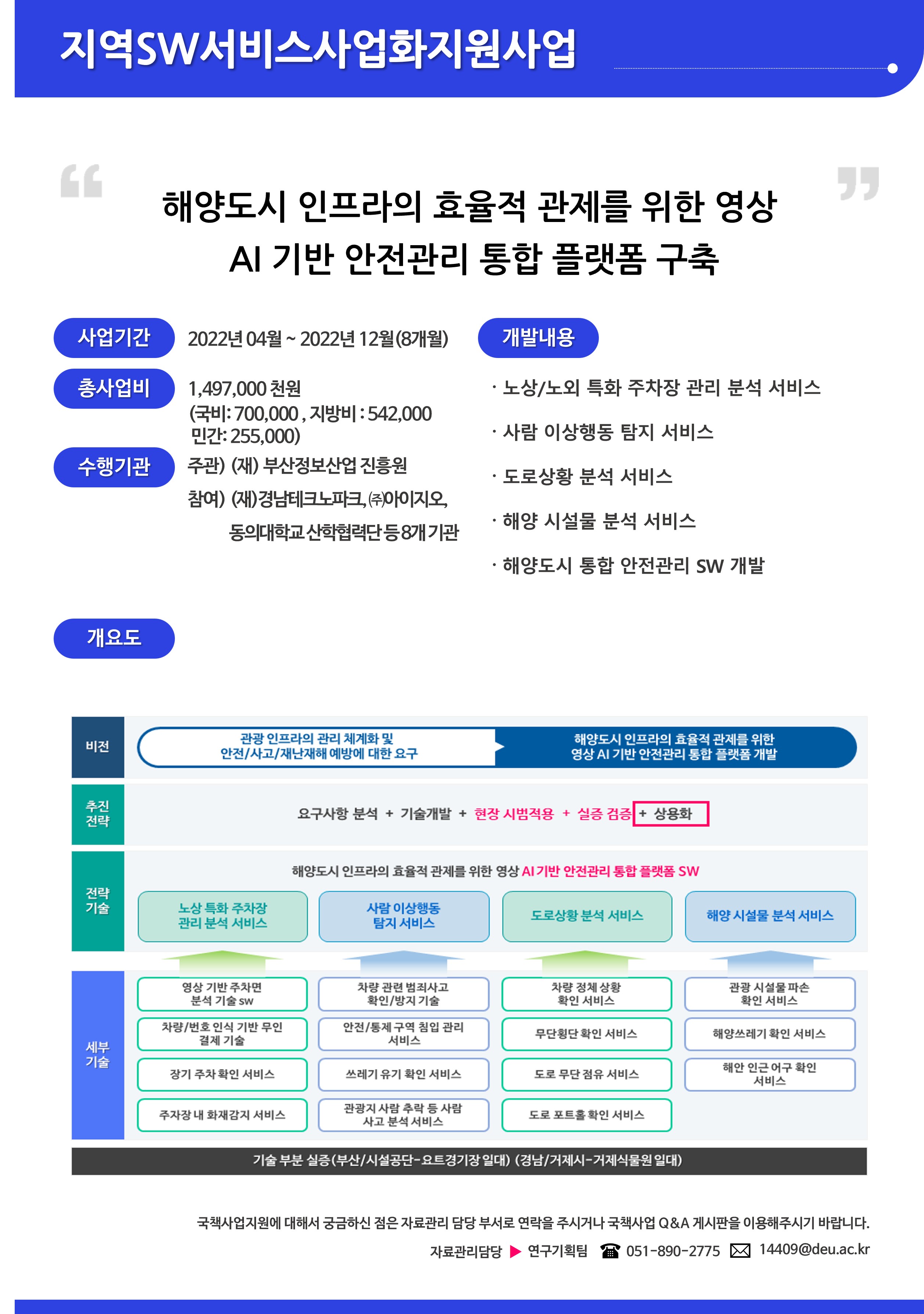 지역SW서비스사업화지원사업 페이지 정보 작성자 부산IT융합부품연구소 작성일24-06-05 15:08 조회738회 댓글0건 이전글 다음글 목록 사업명 지역SW서비스사업화지원사업 과제명 해양도시 인프라의 효율적 관제를 위한 영상 AI 기반 안전관리 통합 플랫폼 구축 사업기간 2022-04-01 ~ 2022-12-31 (9개월) 총 사업비 1,497,000천원 수행기관 주관) 부산정보산업진흥원 / 참여) (재)경남테크노파크, ㈜아이지오, 동의대학교 산학협력단 등 8개 기관 부처 정보통신산업진흥원 상태 종료사업 본문 이전글 다음글 목록