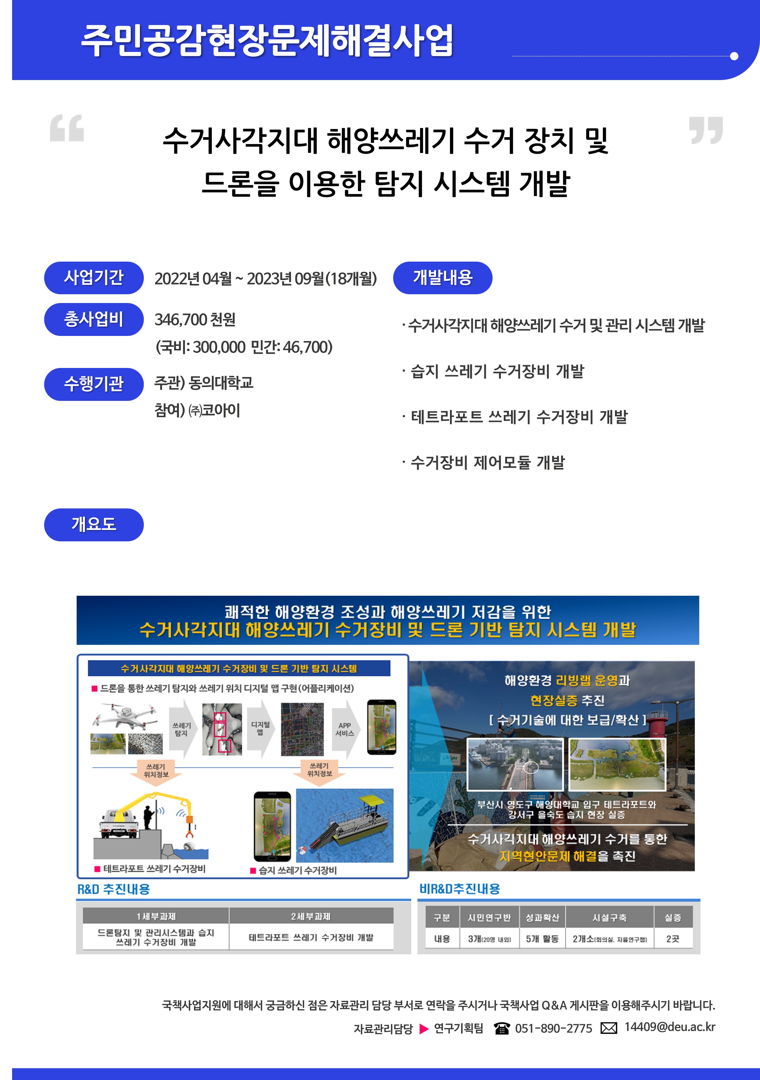 주민공감현장문제해결사업 페이지 정보 작성자 부산IT융합부품연구소 작성일24-06-05 15:12 조회740회 댓글0건 이전글 다음글 목록 사업명 주민공감현장문제해결사업 과제명 수거사각지대 해양쓰레기 수거 장치 및 드론을 이용한 탐지 시스템 개발 사업기간 2022-04-01 ~ 2023-06-30 (15개월) 총 사업비 346,700천원 수행기관 주관) 동의대학교 / 참여) (주) 코아이 부처 과학기술정보통신부 상태 종료사업 본문 이전글 다음글 목록