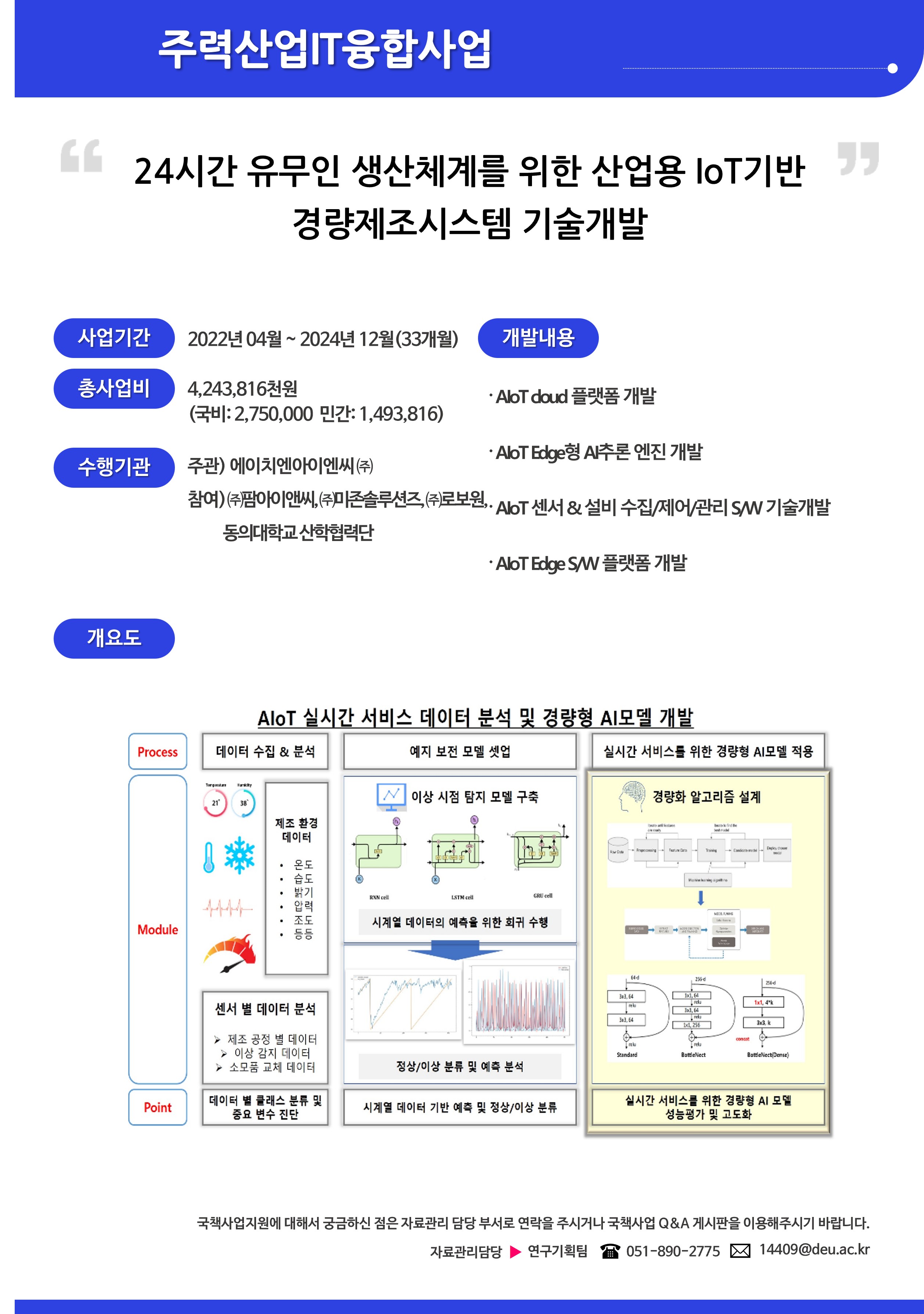 주력산업 IT 융합사업 페이지 정보 작성자 부산IT융합부품연구소 작성일24-06-05 15:15 조회736회 댓글0건 이전글 다음글 목록 사업명 주력산업 IT 융합사업 과제명 24시간 유무인 생산체계를 위한 산업용 IoT기반 경량제조시스템 기술개발 사업기간 2022-04-01 ~ 2024-12-31 (33개월) 총 사업비 4,243,816천원 수행기관 주관) 에이치엔아이엔씨(주) / 참여) (주)팜아이앤씨, (주)미존솔루션즈, (주)로보원, 동의대학교산학협력단 부처 산업통상자원부 상태 종료사업 본문 이전글 다음글 목록