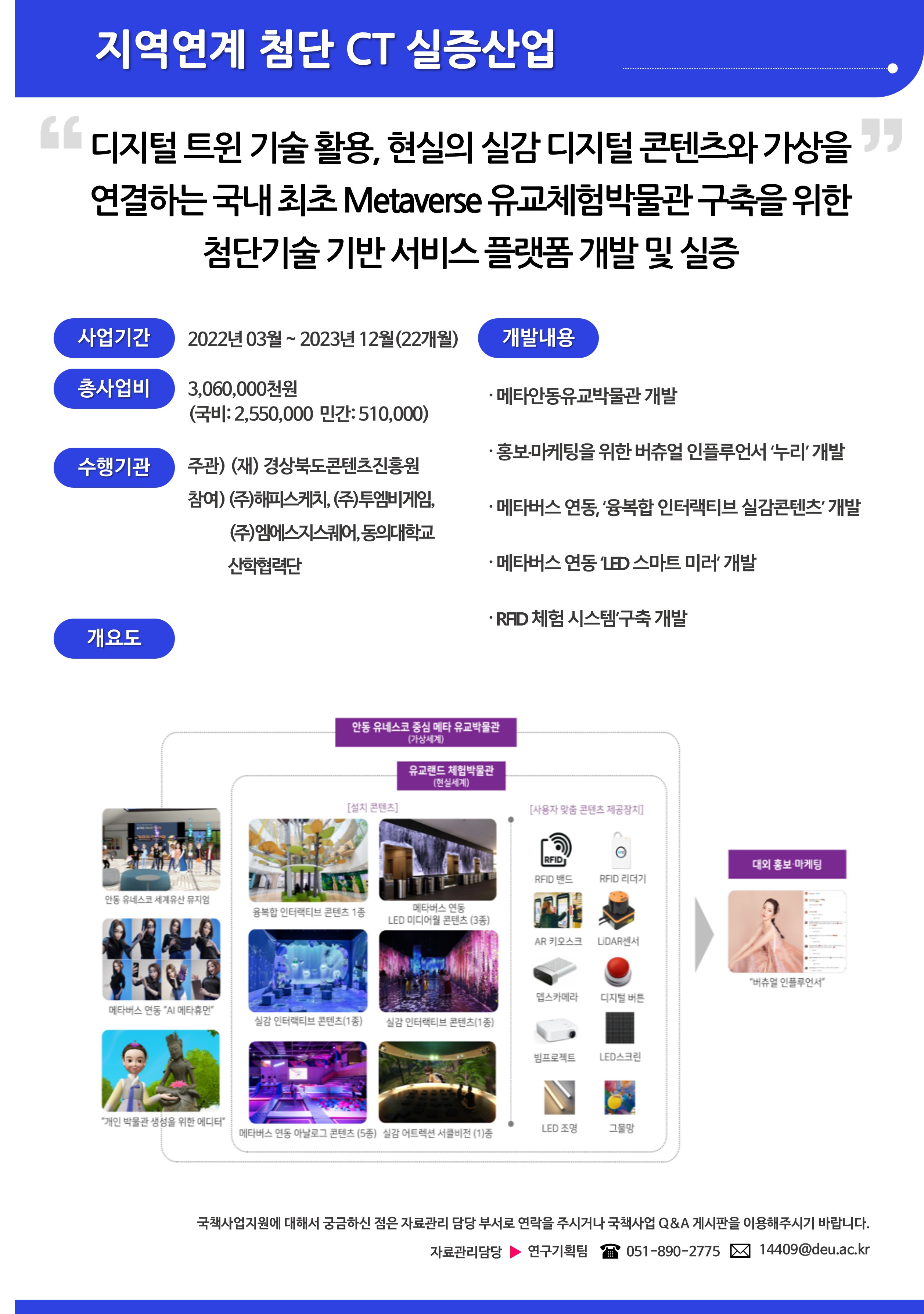 | 과제명 | 디지털 트윈 기술 활용, 현실의 실감 디지털 콘텐츠와 가상을 연결하는 국내 최초 Metaverse 유교체험박물관 구축을 위한 첨단기술 기반 서비스 플랫폼 개발 및 실증 |
